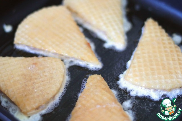 На вафельный треугольник добавить 1 ст. ложку фарша из мяса индейки. Распределить фарш по всей поверхности треугольника. Накрыть фарш вторым треугольником, слегка прижать обе части треугольника. Каждый треугольник обмакнуть в подготовленный яичный льезон.