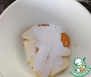 2. Для приготовления теста размягченное при комнатной температуре масло смешиваем с сахарной пудрой и желтками и хорошо взбиваем миксером.