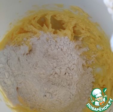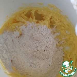 3. Добаляем муку, разрыхлитель и продолжаем взбивать.