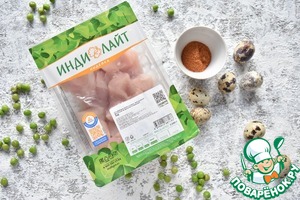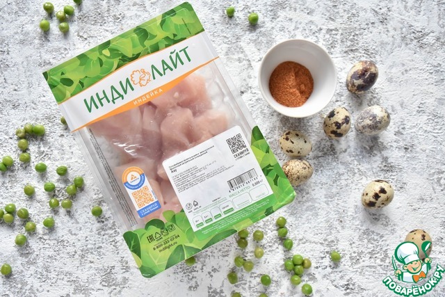 Подготовить необходимые продукты. Горошек можно использовать консервированный. Предварительно бланшировать его пару минут в подсоленном кипятке, а затем погрузить в холодную воду.