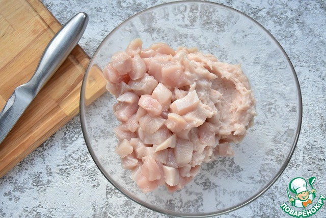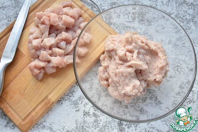 Половину мяса индейки измельчить в блендере или перекрутить дважды через мясорубку. Оставшееся филе нарезать небольшими кубиками