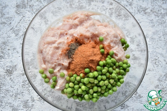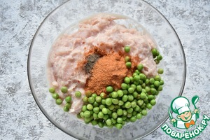 Всыпать смесь специй, зеленый горошек, перемешать чтобы все продукты равномерно распределились между собой.