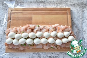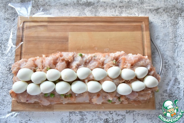 Половину фарша распределить на жаропрочной или коллагеновой пленке. На середину выложить отваренные и очищенные от скорлупы перепелиный яйца.