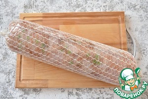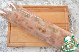 Накрыть яйца сверху оставшимся фаршем. Свернуть все в тугой рулет и закрепить края пленки.