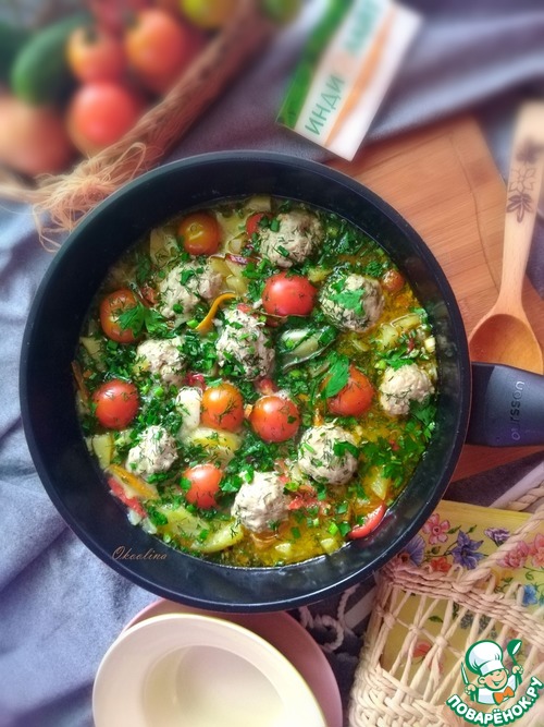 • Заливаем водой на 1 см выше овощей. Накрываем крышкой, доводим до кипения, убавляем огонь на минимум и варим 10 минут. Через 10 минут солим и выкладываем в овощи тефтели, которые формируем мокрыми руками и сразу кладём поверх овощей. Из количества фарша, который я сделала у меня получилось 9 шт стандартных тефтелей. Варим до готовности. Это недолго минут 15-20. Далее кладём помидоры ( я положу целиком), зубчики чеснока, перец чёрный горошком, кольца нарезанного перца чили (у меня 7 колец примерно толщиной 0,4 см), лавровый лист. У чили я убрала семена. Если есть будут дети, то перец чили не кладите, будет остренько. Варим минуты 3-5. Присыпаем рубленной зеленью и снимаем с огня.