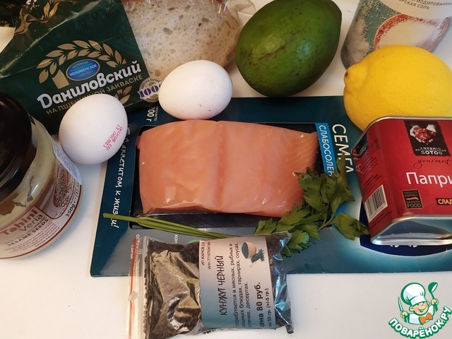 Ингредиенты для «Яйца Бенедикт с лососем, авокадо и тахини»: