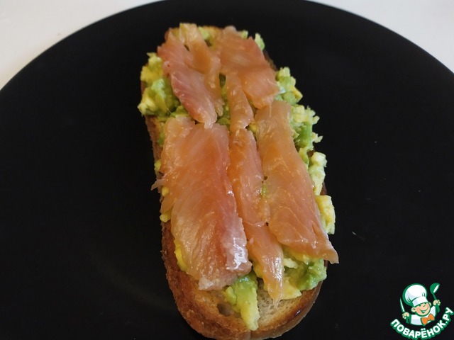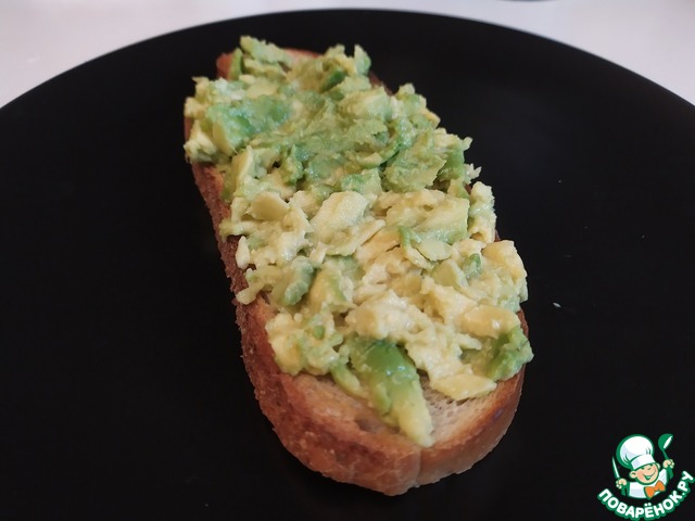 Очистим авокадо. На каждый кусочек хлеба положим по одной половинке авокадо и разомнём его.
