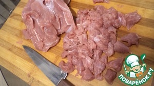 Порезать мясо индейки на небольшие куски. Небольшое количество пленок я удалила.