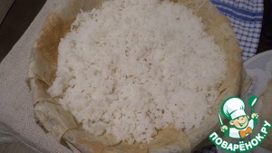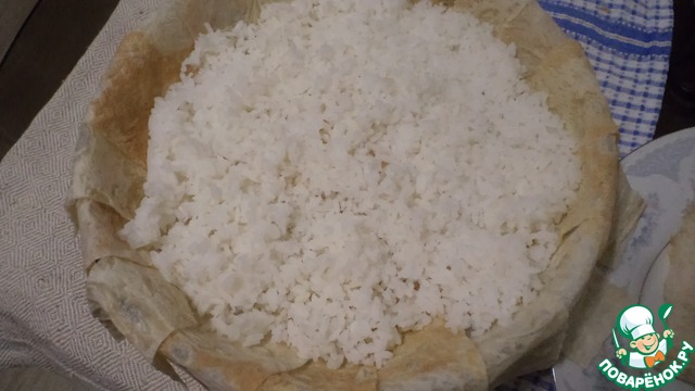 Накрыть рис свисающими частями лаваша, смазывая слегка водой, чтобы лепестки не отваливались друг от друга. Сверху смажем немного сливочным маслом.