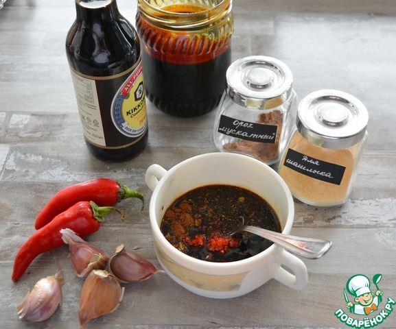 Для маринада соедините соевый соус, измельченный чеснок и острый перец, мелассу, мускатный орех и специи для шашлыка