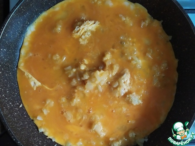 Вольём яйца. Обжарим, не трогая, 30 секунд.
