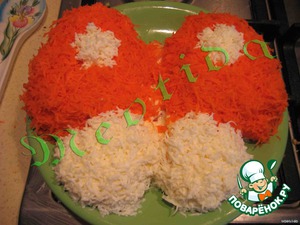 Теперь верх посыпаем тертыми белками и морковочкой.. тут можно делать любые узоры, которые подскажет Ваша фантазия