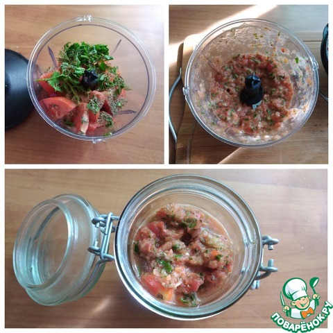 Пока готовятся гнёзда, сделаем живой соус. В домашних условиях все ингредиенты можно разбить и соединить в блендере. На природе - всё можно мелко порезать и растереть прямо в посуде ложкой или толкушкой (чем-то подходящим) или же привезти уже готовый соус.
