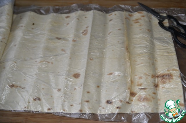 Эту закуску рекомендую приготовить дома, а на пикнике подогреть на решётке мангала. Берём лаваш, у меня пшеничный ролл. Мне он больше нравится, не такой сухой.