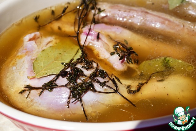 Утиные ножки и крылья выкладываем в форму для запекания. Добавляем тимьян и лавровый лист.
