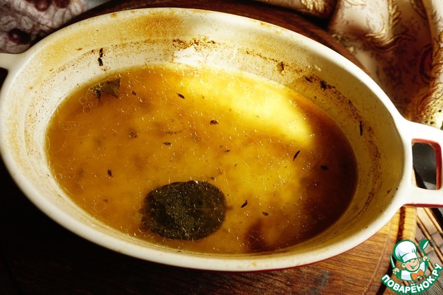 Заливаем бульоном, добавляем коньяк и 1/3 вытопленного утиного жира.