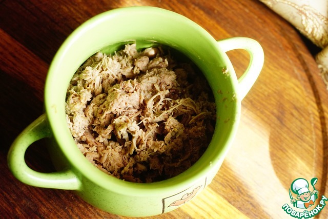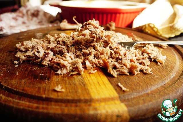 Мясо разбираем на волокна.