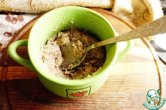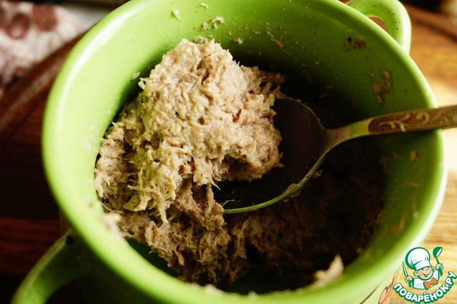 Добавляем к мясу несколько ложек бульона. Перемешиваем. Добавляем еще бульон, снова перемешиваем. И так до того момента, пока не получим кремовую консистенцию паштета.