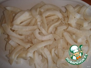 Кальмар по возможности порезать как можно тоньше соломкой.