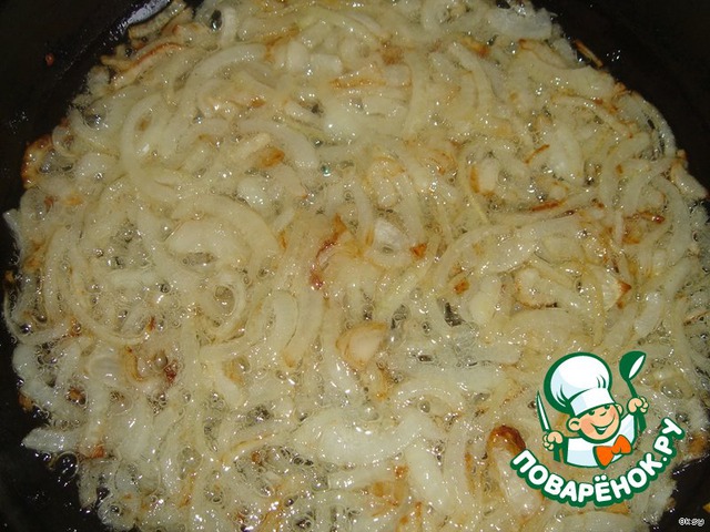 Репчатый лук порезать четверть кольцами и обжарить на растительном масле.