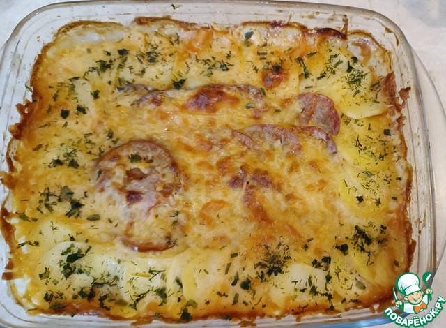 Готово. Если кто-то не уверен в своей духовке и побаивается, что картошка до конца не пропечётся, то перед выкладкой залейте её кипятком минут на пять, это будет стопроцентная гарантия готовности и мягкости. Достаём нашу вкусняшку, посыпаем любимой зеленью, накрываем стол и созываем всех к трапезе.