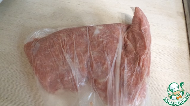 Фарш я кладу в пакет и отбиваю слегка (чтобы не порвался пакет) об стол не менее 40 раз, чтобы он стал плотным.