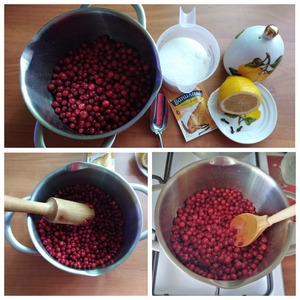 Расход продуктов я дала на 1 кг брусники. Для образца сделаю меньше, убавив всё соответственно. Бруснику в кастрюле, где буду варить, помяла деревянной толкушкой. Я люблю в брусничном джеме чтобы присутствовали ягодки и усердно бруснику мять не буду. Нужно, чтобы она дала сок. Ставим на огонь. Даём закипеть.