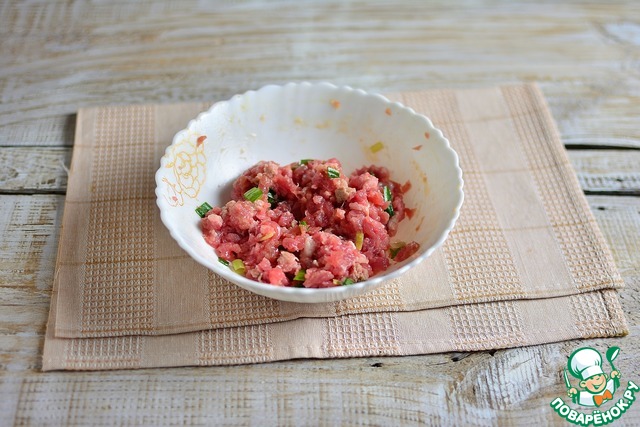 От баранины отрезать лишний жир, провернуть в мясорубке с крупной решеткой, добавить чеснок через пресс (1 зубчик), яйцо, порезанный зеленый лук, яйцо, специи для баранины и соль по вкусу. Перемешать.