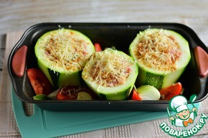 Для красоты можно у "стаканчиков" кабачка срезать кожицу полосками, уложить их в форму для запекания, нафаршировать.