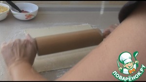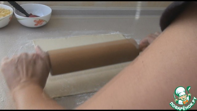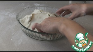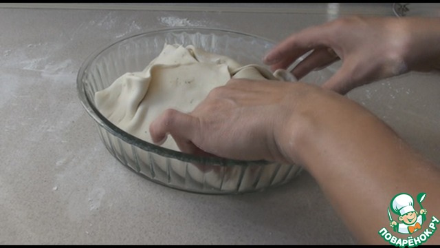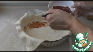 Слоеное тесто разморозить. У меня форма диаметром 24 см, я немного раскатала тесто по размеру формы. Форму смажем подсолнечным маслом.