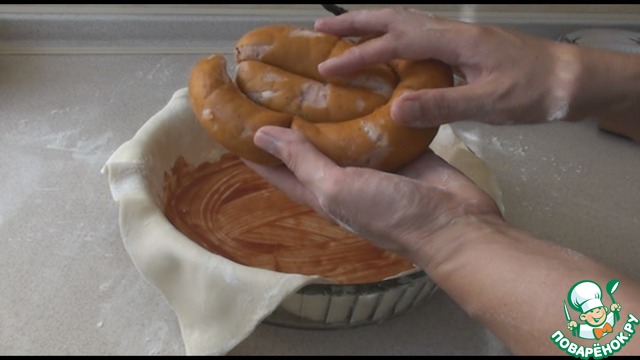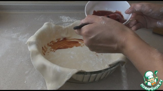 Выкладываем тесто, чтобы бортики свисали. Смажем дно немного кетчупом или томатным соусом.