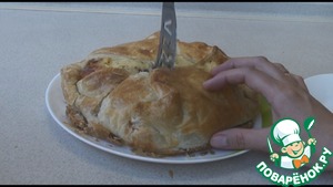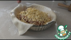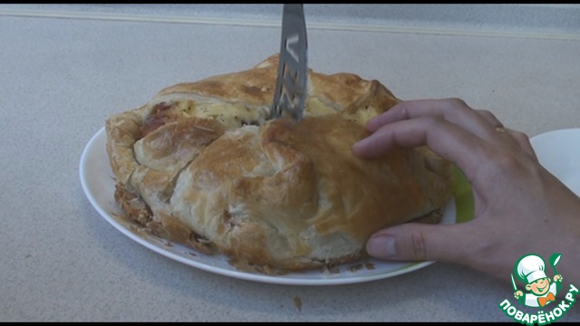 Пирог получается очень хрустящий и вкусный. Сыр тянется, сочетание с колбасками создает сходство с пиццой. Мои дети умяли сразу по два куска!) Приятного аппетита!