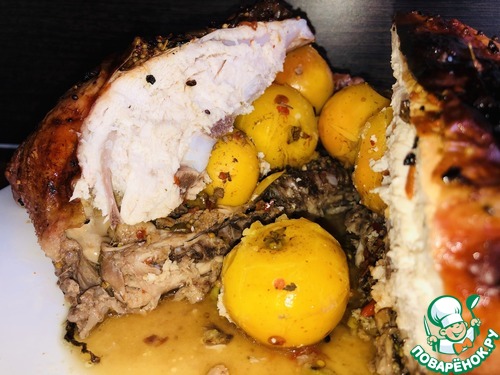 4. Укладываем натёртую специями тушку курицы на виноград, заполняем курицу ранетками и оставляем на 1 час.