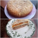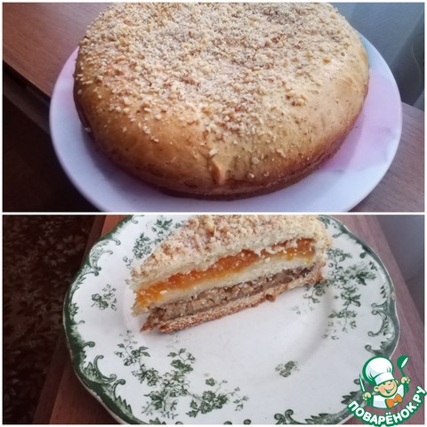 Раскатать меньшую часть теста в круглый пласт и накрыть ею ореховую начинку. Сверху выложить начинку из кураги и накрыть последним слоем теста. Соединить верхнюю часть теста с нижней.