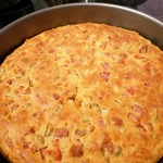 Дополнительно к тесту я добавлю мелко порезанный болгарский перец, ветчину, и оливки. Опять всё перемешаю. Выложу в форму подмазанную оливковым маслом и поставлю в духовку на 30 минут, выставив Т-180 С. Форма у меня овальная с большой осью-21 см и малой-15 см, высотой-4 см. Если вы будите делать кейк из полной нормы ингредиентов, то время выпечки у вас увеличится. Ориентируйтесь на свою духовку. Проверяем на "сухую лучину". Кейк готов, тесто к лучине не пристаёт, но не забываем что в нём много сыра и он расплавился.