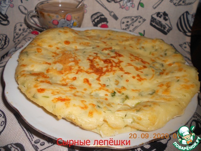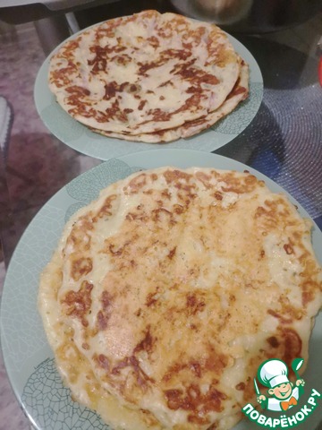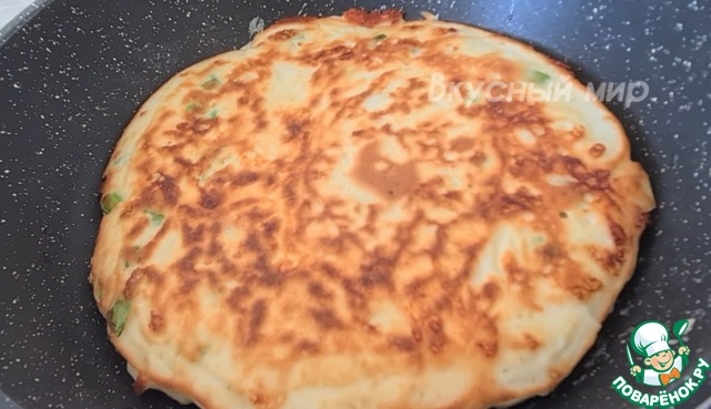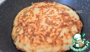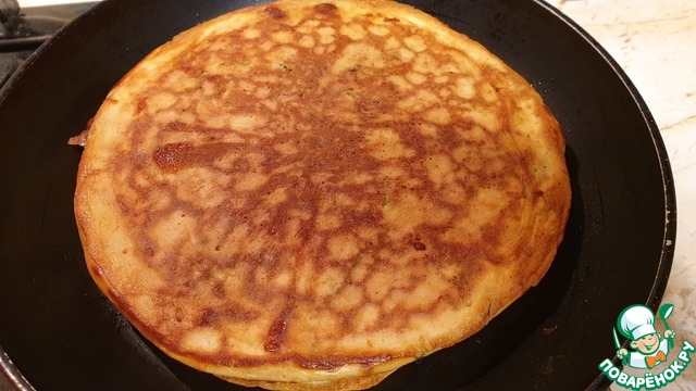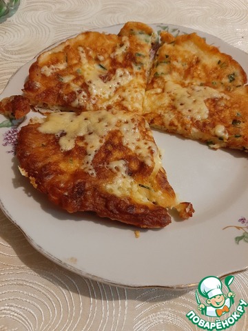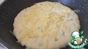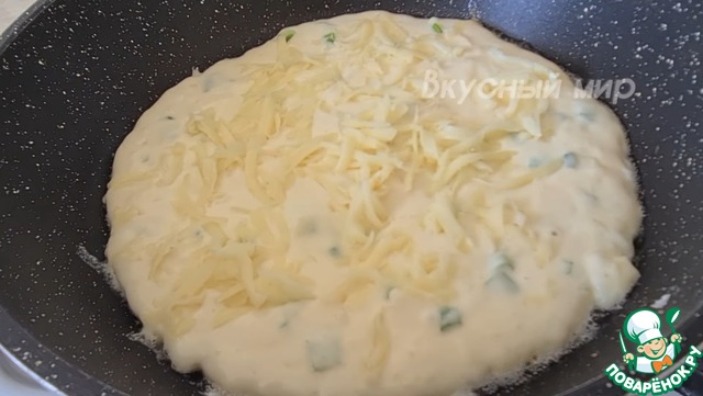 Разогреть сковороду, у меня диаметр 24см, смазать маслом, выложить часть теста, разровнять, присыпать натертым сыром