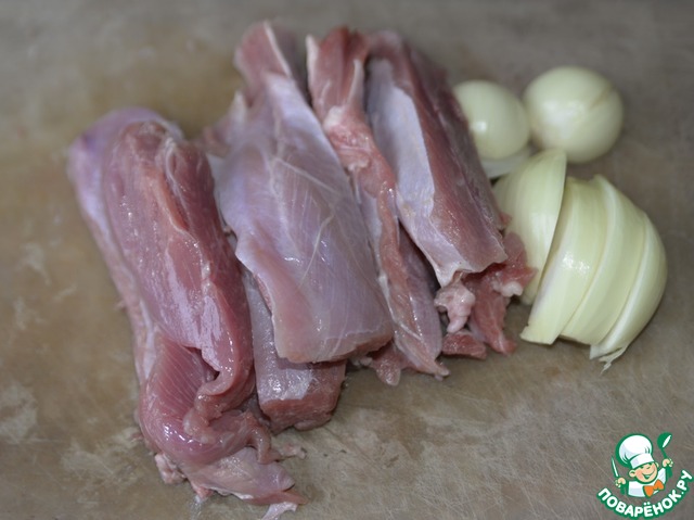Готовим фарш для котлет. Берём филе индейки, у меня бескостная голень. Режем на кусочки. Лук чистим, режем. Перекручиваем филе индейки и лук на мясорубке.
