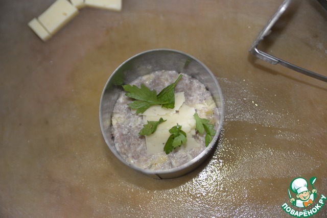 Формуем из фарша котлеты. Поверхность доски для удобства смазываем маслом. Удобно делать ровные котлеты с помощью кулинарного кольца и толкушки. Кладём внутрь кольца немного фарша, приминаем толкушкой, далее кладём кусочек любого твёрдого сыра.