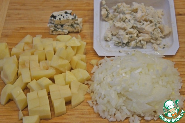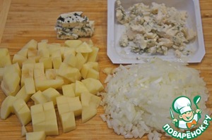 Картофель нарезать кубиками, лук измельчить. Сыр раскрошить или размять вилкой.