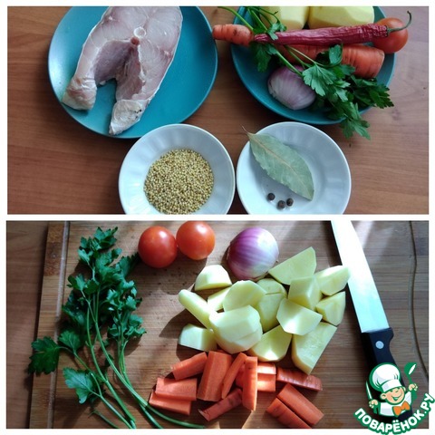 Готовим продукты для супа. Из рыбы я возьму стейк сазана и разрежу его на 2 части. Овощи резать мелко не нужно, режем как на природе, когда уху варим в котелке на костре. Лук оставляем целым. Петрушку связываем в пучок нитью. Лучше взять корень петрушки, у меня не было. Морковь и картофель нарезаем произвольно крупненько. Помидоры я оставлю целыми.