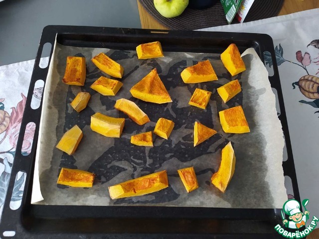 1. Приготовить заранее тыкву: очистить, нарезать на кусочки, выпекать на пергаменте на предварительно смазанном маслом противне при t 180 C 40 минут.
