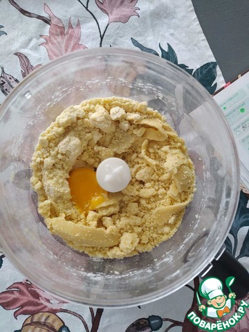 2. Пока печется тыква приготовим тесто: в чаше блендера смешать муку, нарезанное охлажденное масло, около минуты взбиваем блендер, добавить сахар, соль, воду, желток и ещё пару минут поработать блендером. Должна получиться крупная крошка.