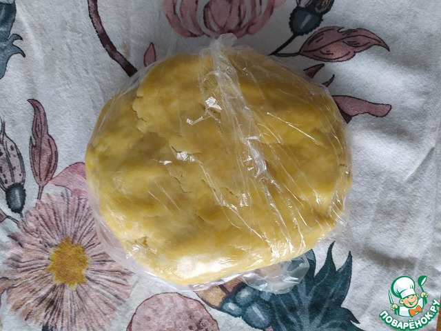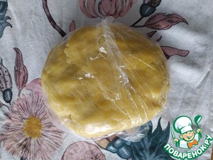 3. Тесто вымешиваем руками в ком, если сильно рассыпается - смочить руки. Формируем шар, заворачиваем в пленку, убираем в холодильник на полчаса.