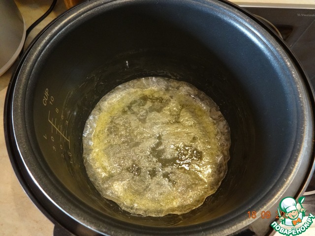 Вырезаем из пергаментной бумаги круг, равный диаметру дна чаши мультиварки. Включаем мультиварку в режим "Выпечка", смазываем дно сливочным маслом. Затем кладем вырезанный из бумаги круг и его тоже смазываем маслом.