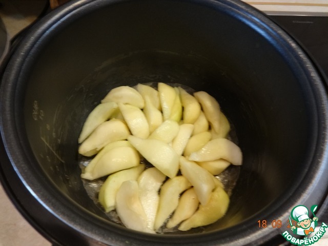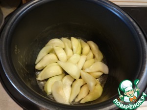 Груши очищаем от кожуры и семечек, нарезаем дольками и плотно и тесно укладываем на дно чаши.