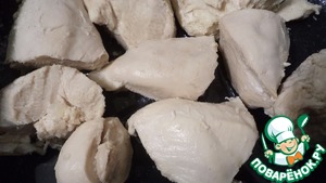 Филе цыпленка режем небольшими кусочками и выкладываем в блюдо.