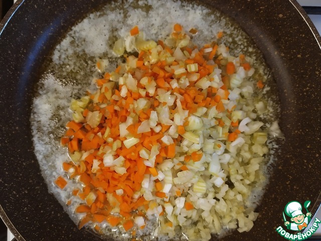 Добавим мелко нарезанные сельдерей, морковь и лук. Обжарим до мягкости.