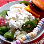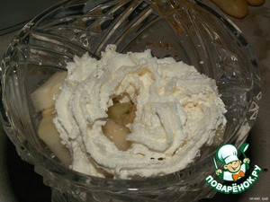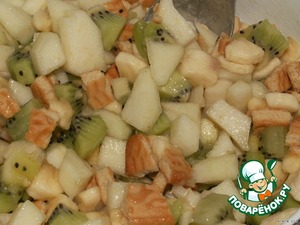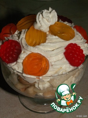 Следующий слой - фрукты с печеньем, далее - снова сливки, далее - опять фрукты с печеньем.