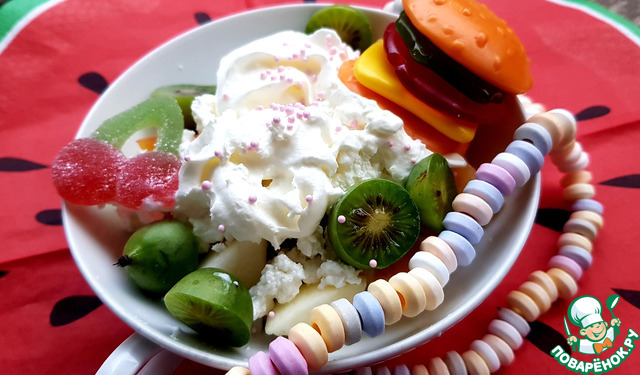 Сверху хорошенько выложить сливки, украсить жевательным мармеладом.