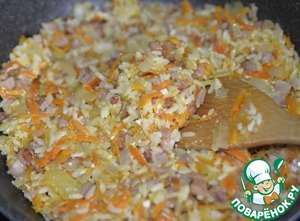 Морковь и болгарский перец (1 шт) моем, чистим, измельчаем, я использовала кухонный комбайн, кладём к луку и тушим на среднем огне овощи около 10 минут.